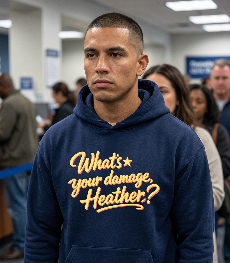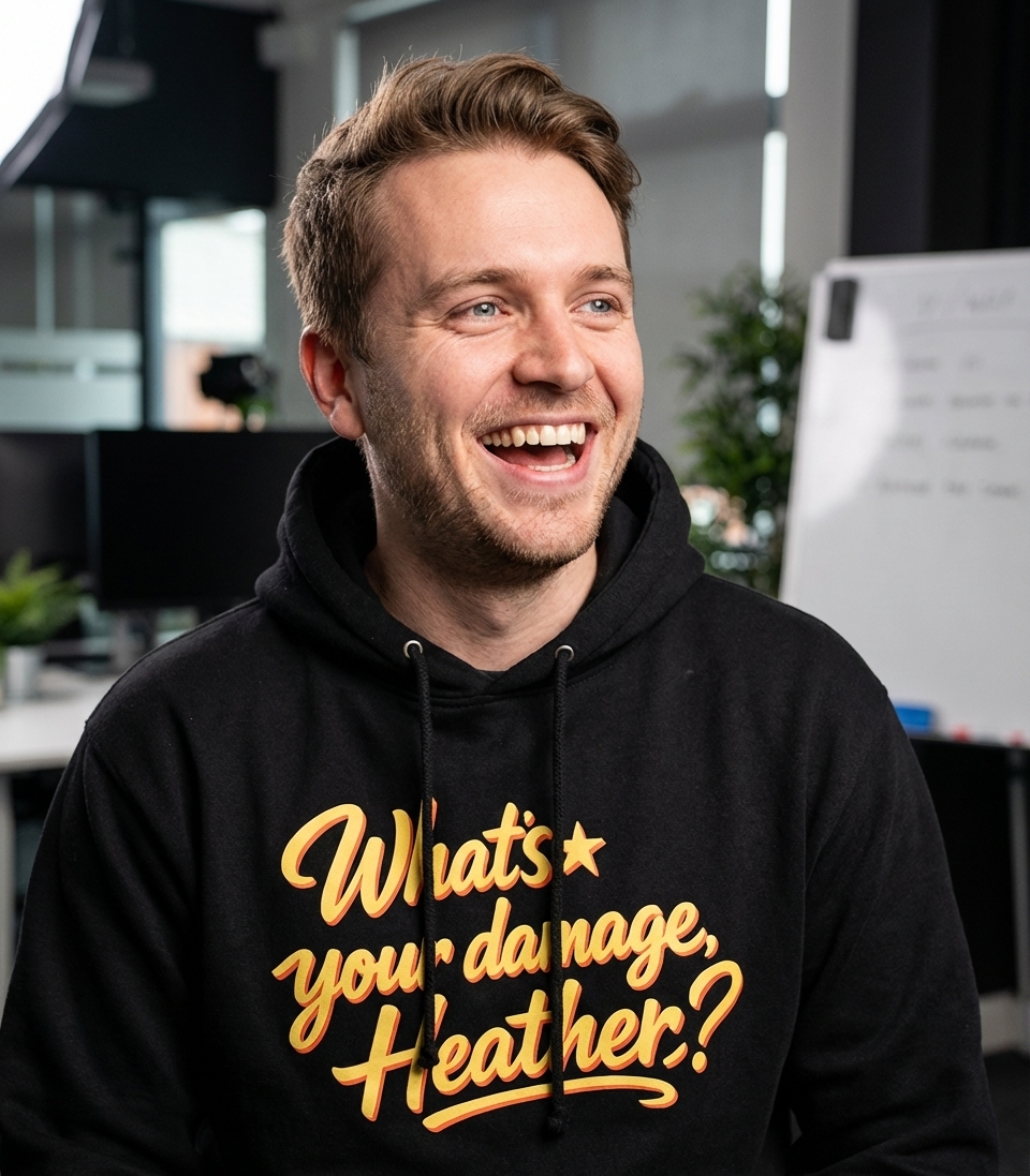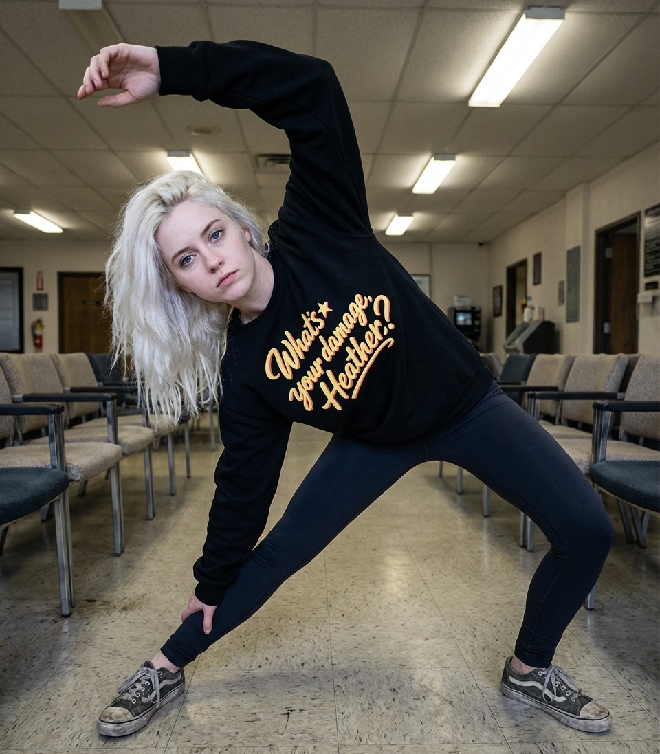 This graphic features the memorable quote "What's your damage, Heather?" from the iconic 1980s cult classic film, Heathers. The design uses a retro-inspired, script font that perfectly complements the movie's vintage aesthetic. It’s a subtle nod to a beloved piece of cinematic history.