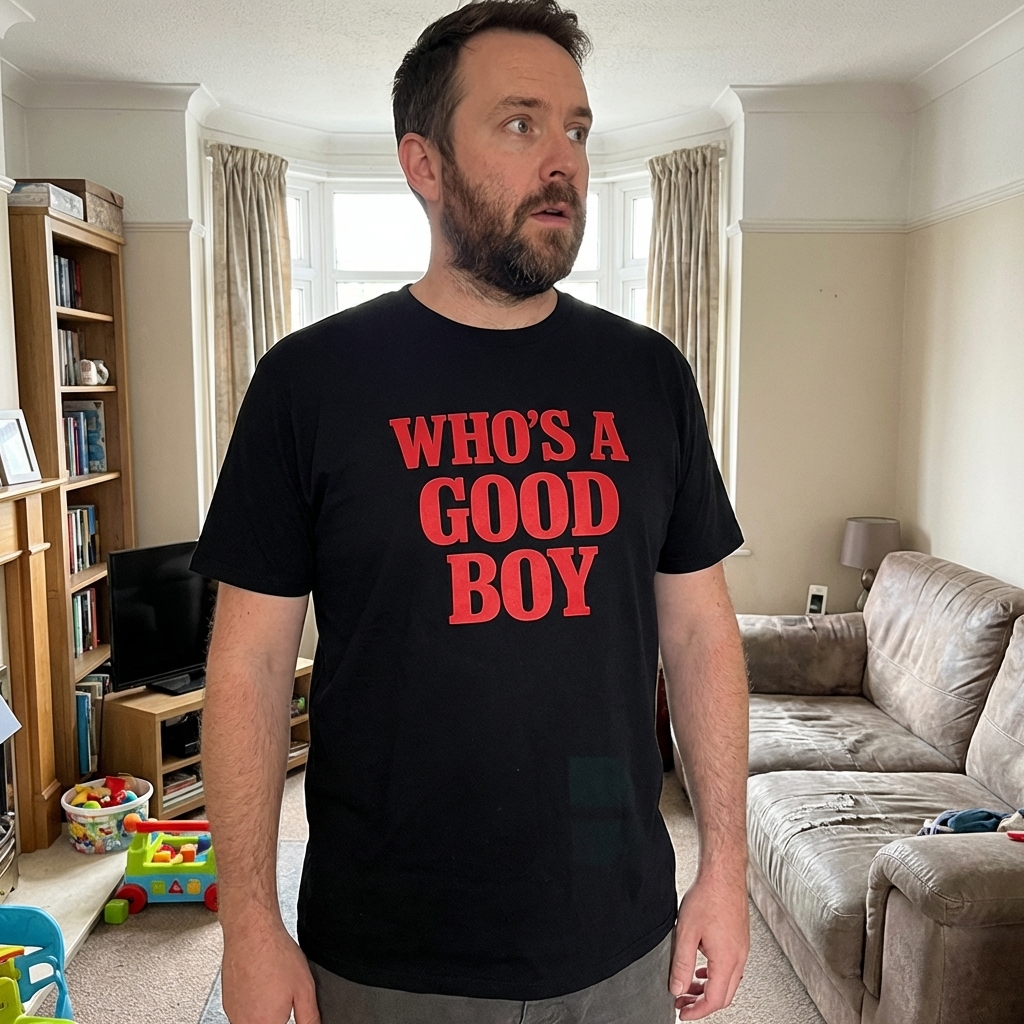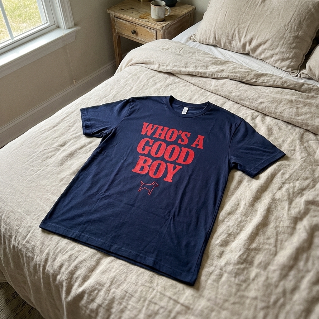 This design features the beloved phrase "Who's A Good Boy" rendered in a bold, classic red typeface against a stark black background. The simplicity of the graphic makes it instantly recognizable and universally appealing to dog lovers.