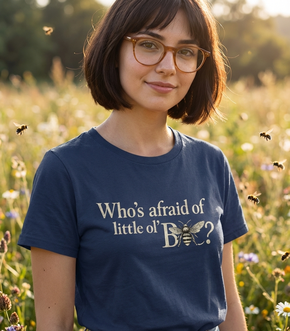 This whimsical design features the playful question "Who's afraid of little ol' B?" with an intricately drawn bee cleverly replacing the letter 'B'. It combines classic typography with a detailed insect illustration, creating a memorable and lighthearted visual.