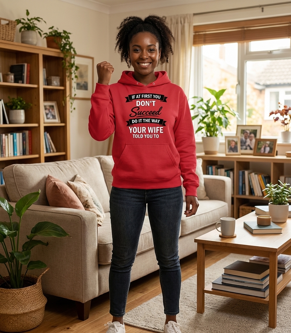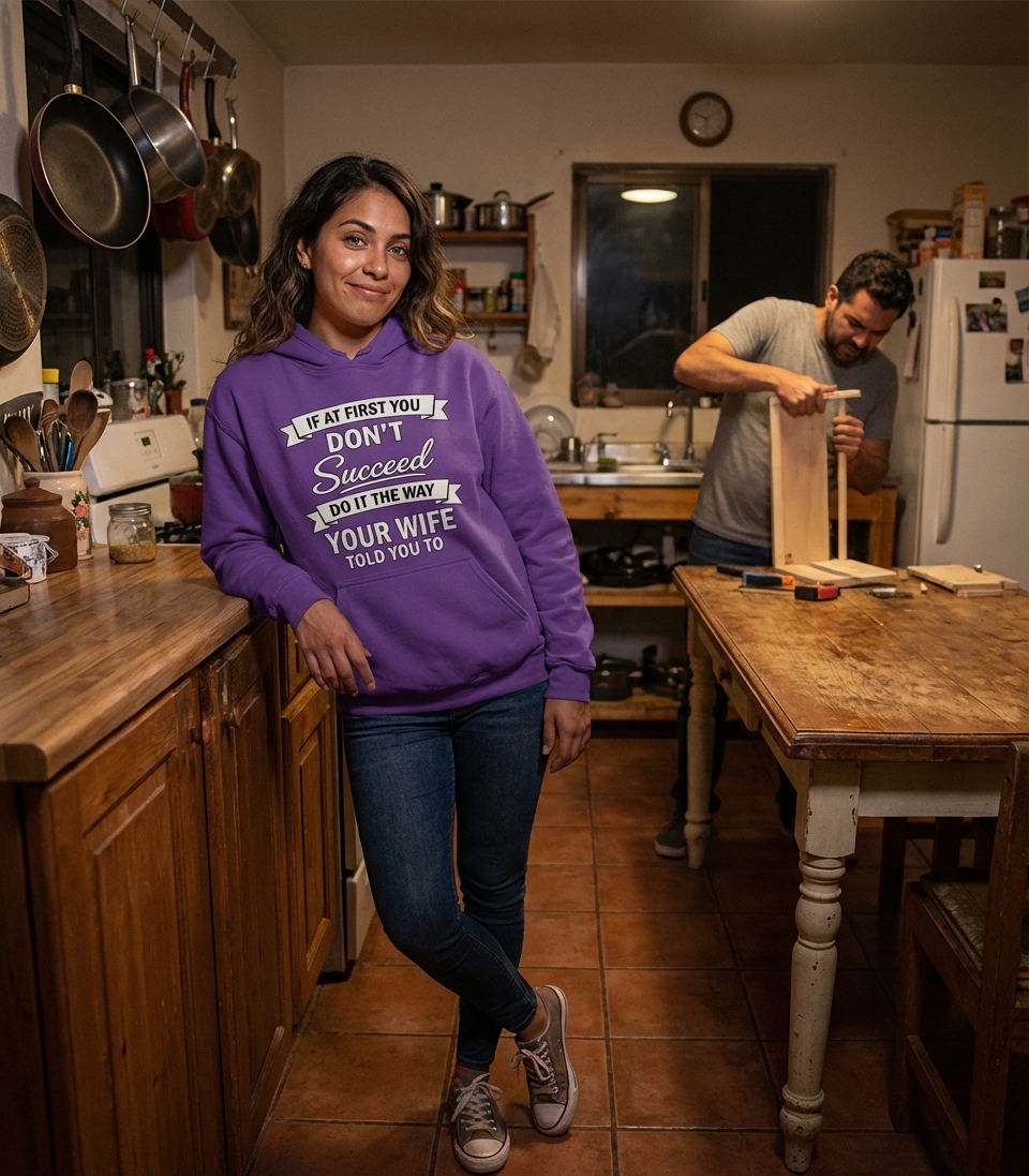 The phrase "If at first you don't succeed, do it the way your wife told you to" is a classic comedic take on the common experience of husbands realizing their wives' initial advice was accurate. It highlights the playful power dynamics and unspoken wisdom often found within a marriage.