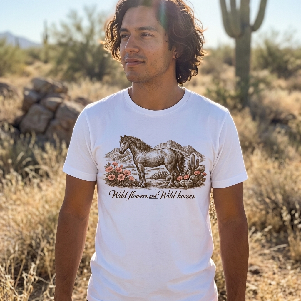 The 'Wild Flowers and Wild Horses' phrase captures the lifestyle of free spirits who appreciate the untamed beauty of nature, majestic equines, and serene desert landscapes.
