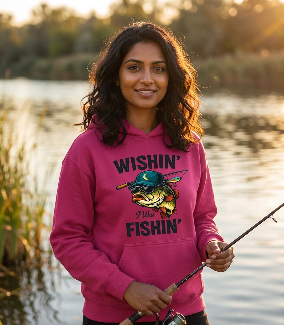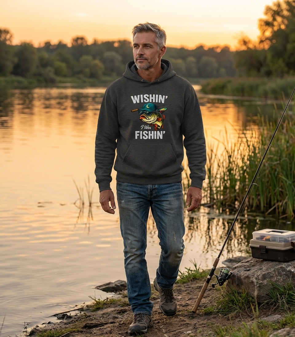 The "Wishin' I Was Fishin'" phrase captures the lifestyle of passionate anglers who spend their days casting lines, reeling in catches, and dreaming of the next big fish.