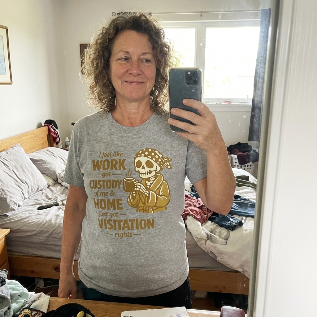 The 'Work Got Custody' phrase captures the lifestyle of tired professionals who spend their days in the office, balancing duties, and longing for home.