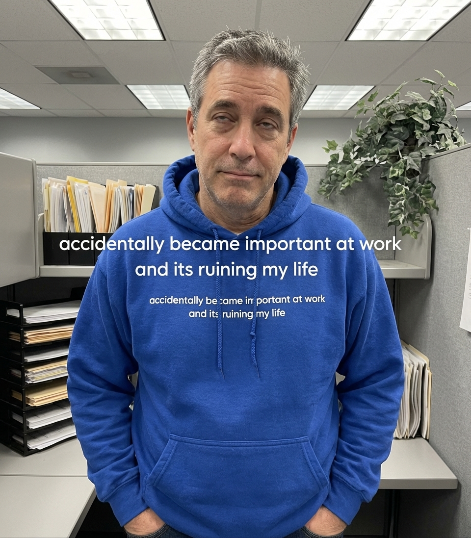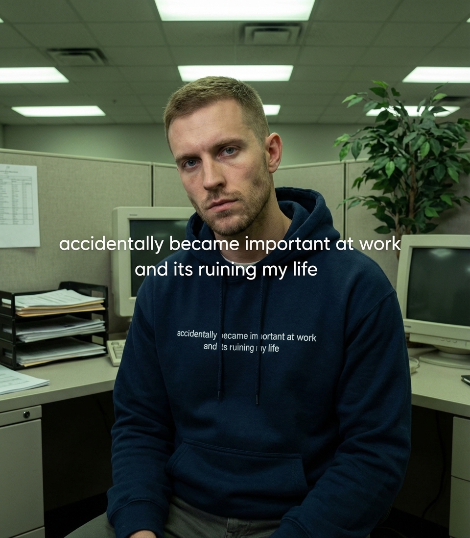 The phrase "accidentally became important at work and its ruining my life" encapsulates the relatable struggle of escalating responsibilities that can paradoxically feel like a detriment to personal life. It's about achieving a level of importance that was never sought, leading to an imbalance in work-life dynamics. This resonates with those who are competent, perhaps too competent, and now bear the weight of their own professional success.