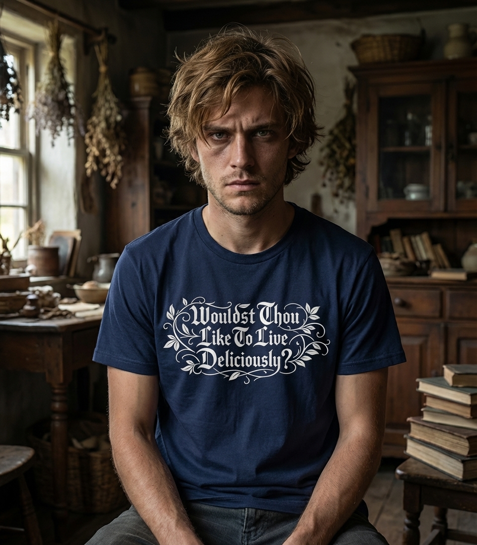 This captivating t-shirt design features the infamous phrase "Wouldst Thou Like To Live Deliciously?" rendered in an elaborate gothic script. It's elegantly framed by intricate, swirling botanical vines, creating a visually rich and mysterious aesthetic. The artwork evokes a sense of ancient dread and dark enchantment.