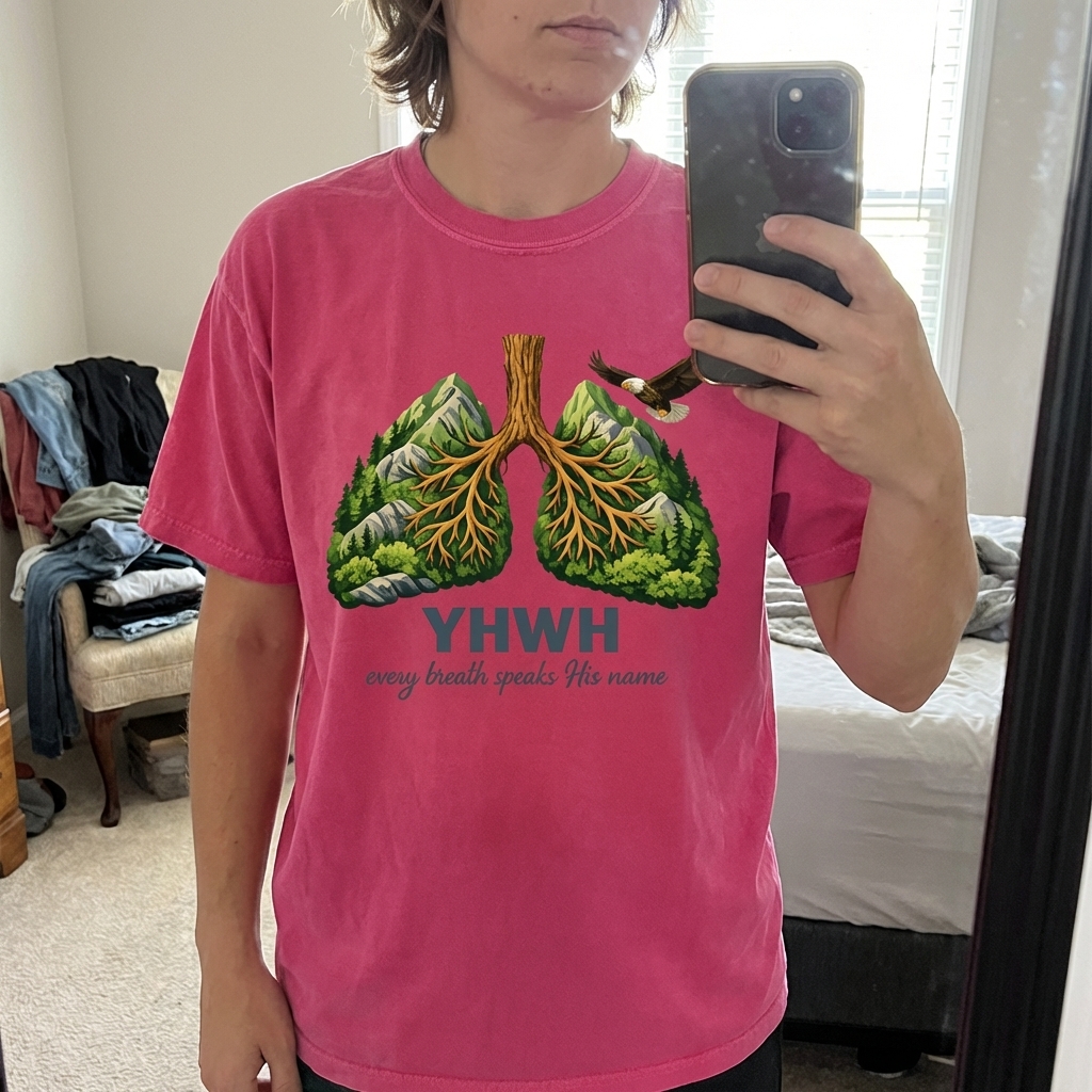 The 'YHWH Every Breath' message captures the lifestyle of spiritual individuals who reflect on divine presence, appreciate nature's grandeur, and find inspiration in every moment.