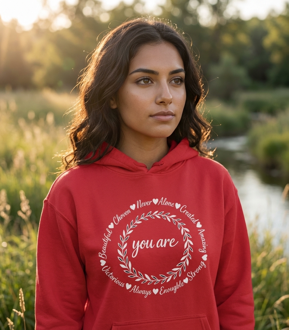 This inspirational design features a beautifully styled wreath encircling the core message "you are". It is adorned with powerful affirmations such as "Beautiful," "Chosen," "Never Alone," "Strong," and "Victorious," all supported by specific Bible verse references that underscore their spiritual foundation.