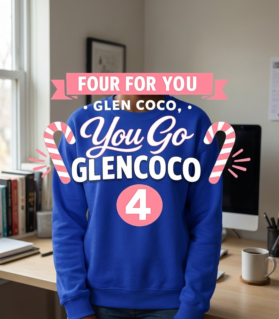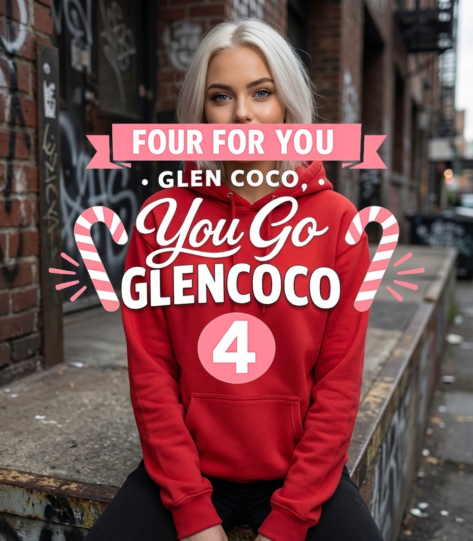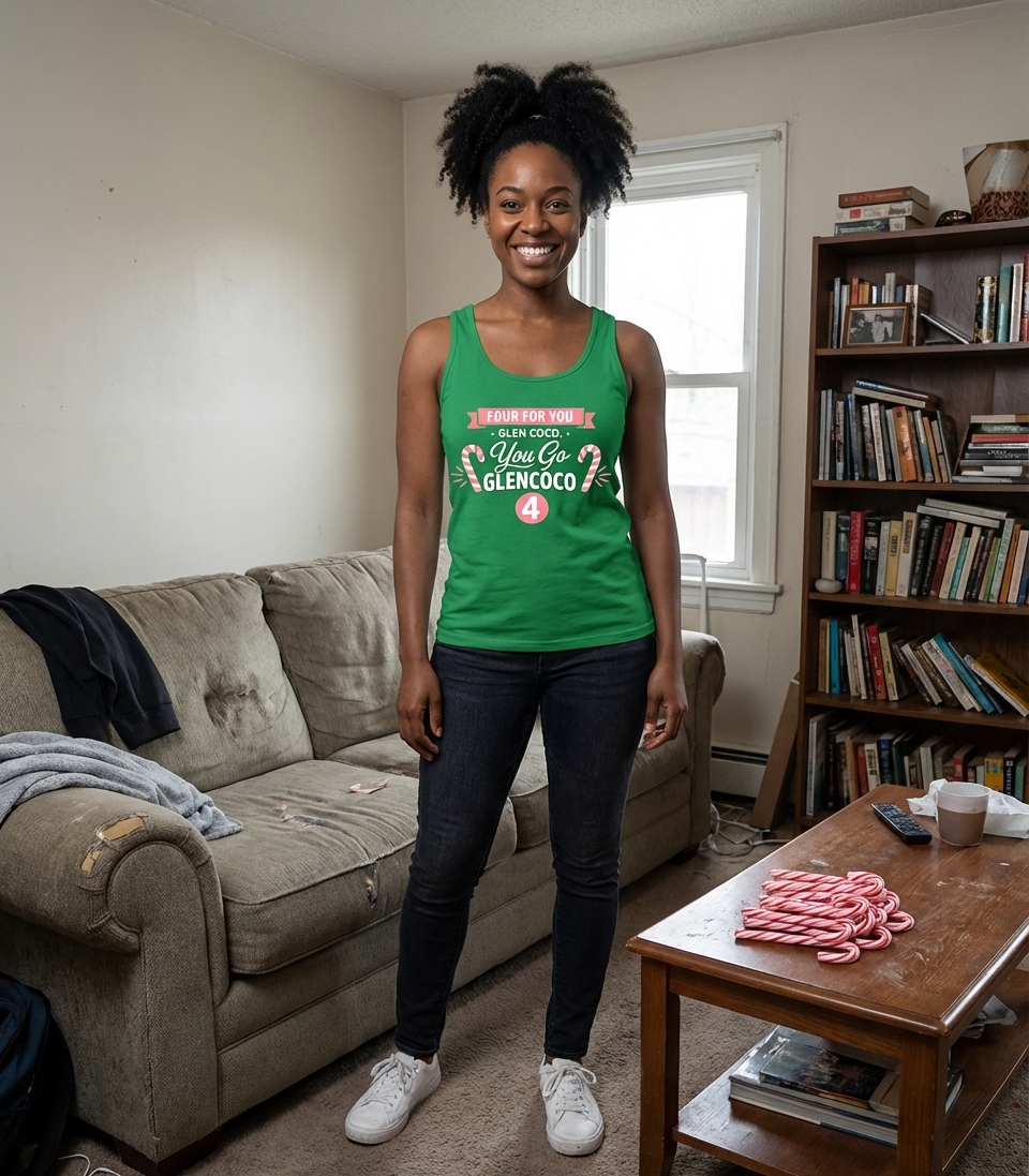 This graphic tee features the iconic phrase "FOUR FOR YOU GLEN COCO, YOU GO GLENCOCO" rendered in a playful, festive typography. It is adorned with classic candy cane illustrations and the number '4', emphasizing the memorable line. The design combines holiday cheer with a well-loved pop culture reference.