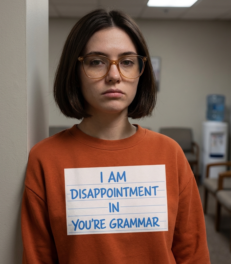 The phrase "I am disappointment in you're grammar" intentionally uses the incorrect "you're" to illustrate the very issue it laments. It's a self-aware, sarcastic commentary on the widespread decline in grammatical precision, often seen by language purists.