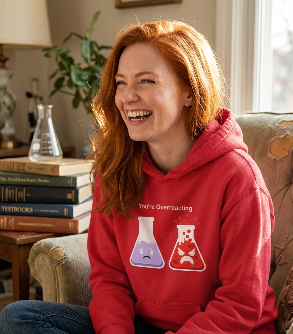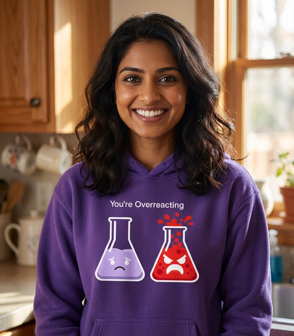 The phrase "You're Overreacting" is a direct, often sarcastic, comment made to someone perceived as having an exaggerated emotional response to a situation. In this design, it also ingeniously plays on the chemical term "reaction."