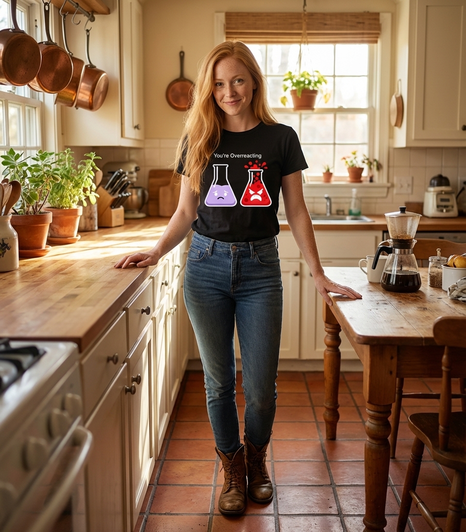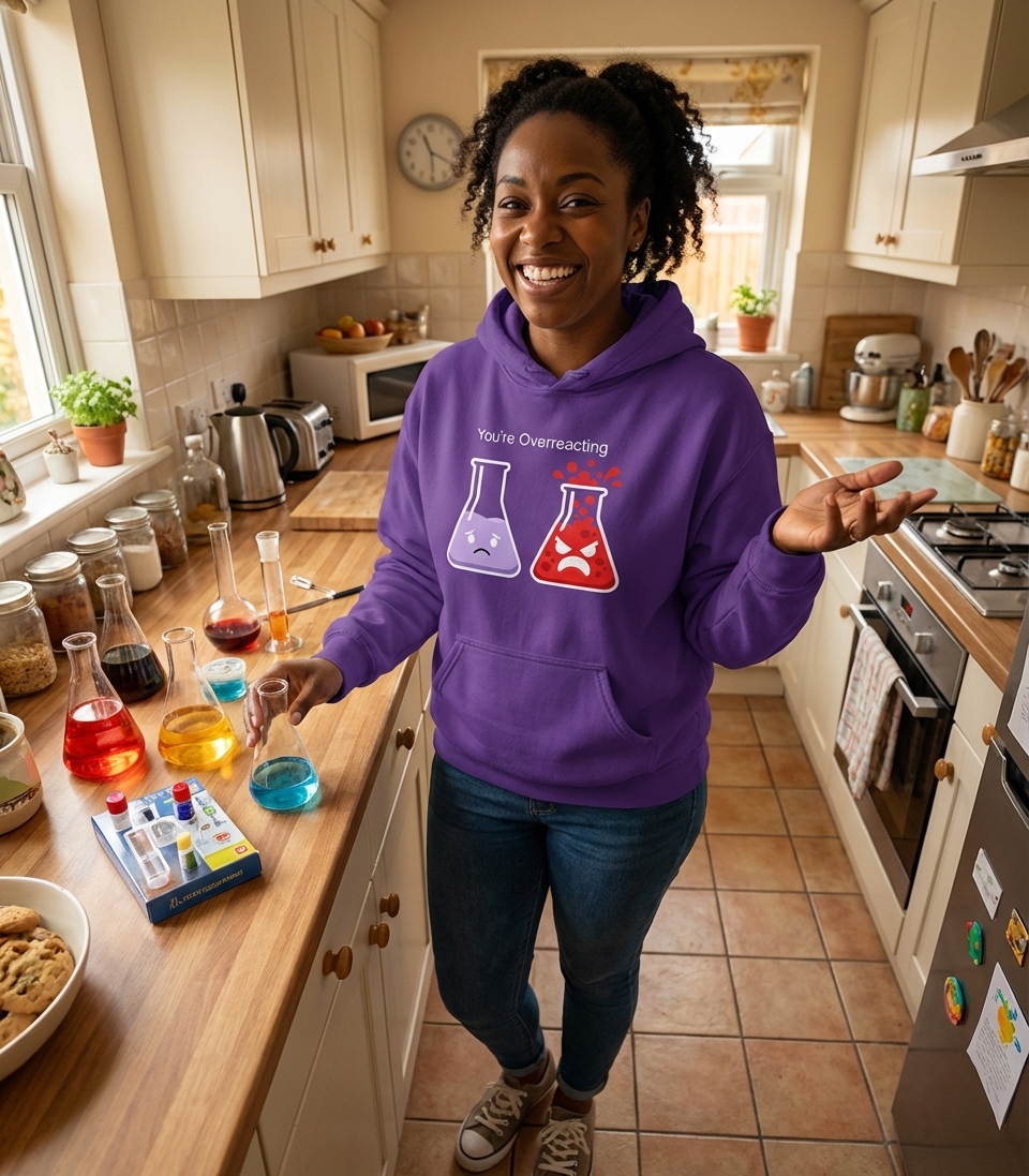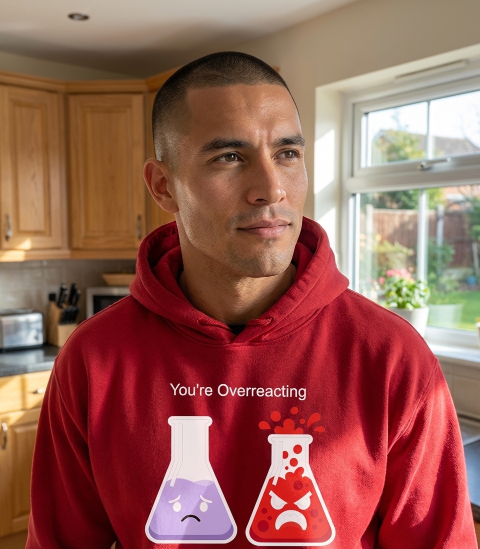 The 'You're Overreacting' phrase playfully captures the dynamics of a dramatic person through a clever science pun, perfect for those who appreciate witty commentary and laboratory jokes.