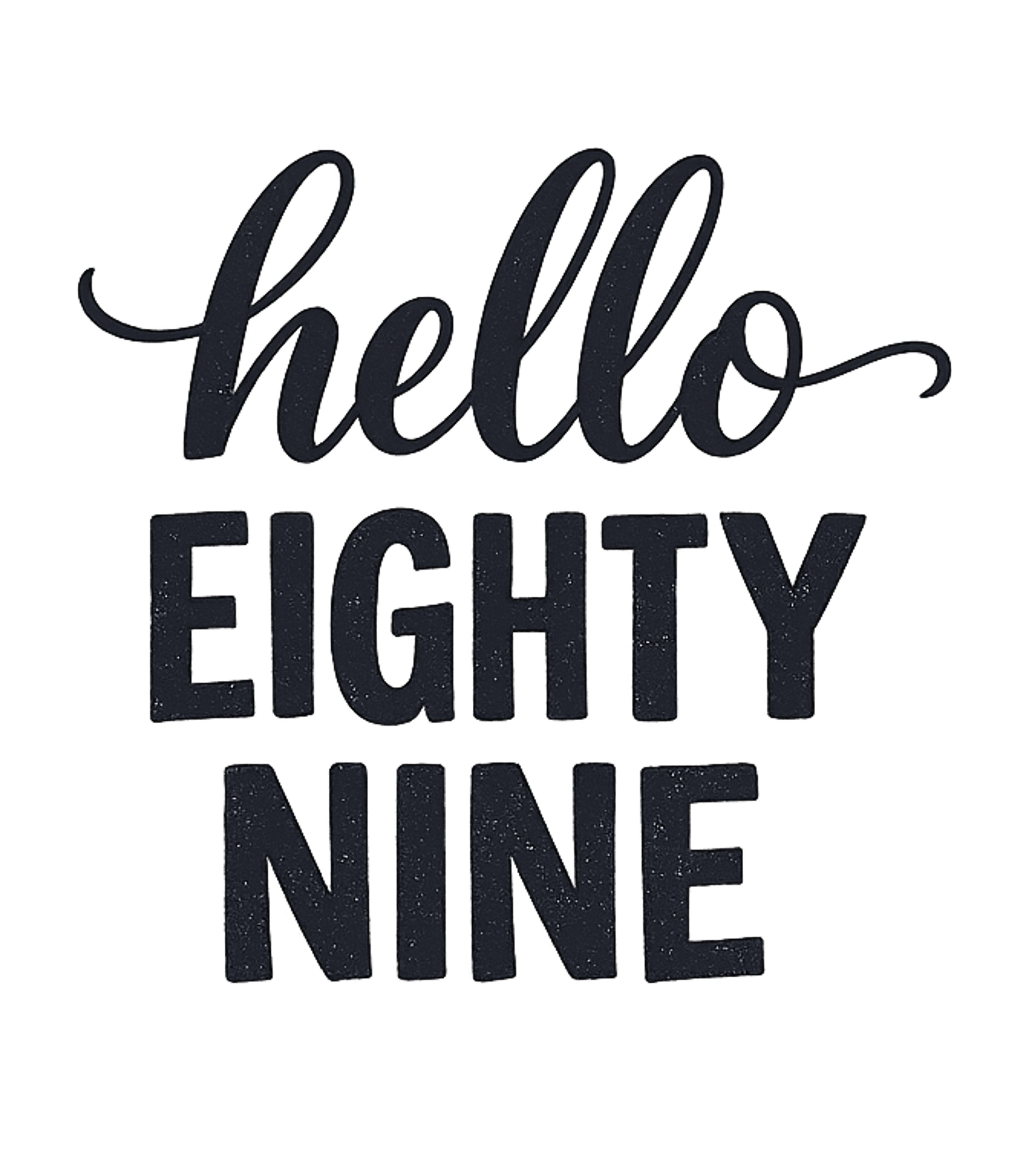 This graphic features the cheerful greeting "Hello" in an elegant script font, paired with "EIGHTY NINE" in a bold, textured block lettering. The design subtly highlights the milestone age in a contemporary and understated style.