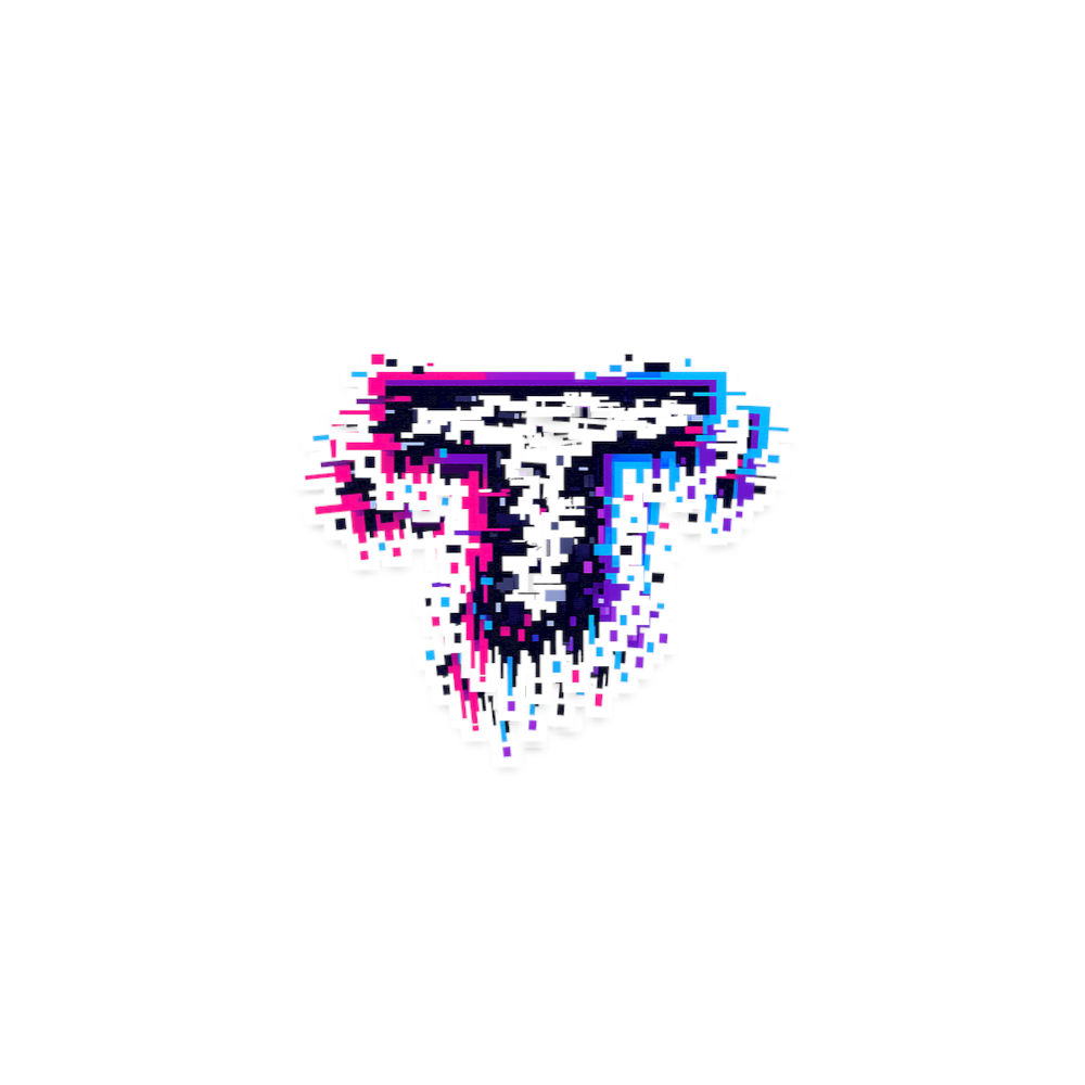 This striking graphic features a stylized letter "T" or similar geometric block, rendered with a dynamic glitch effect. Vibrant neon pink, purple, and blue pixels create a sense of digital distortion and movement against a solid black background.