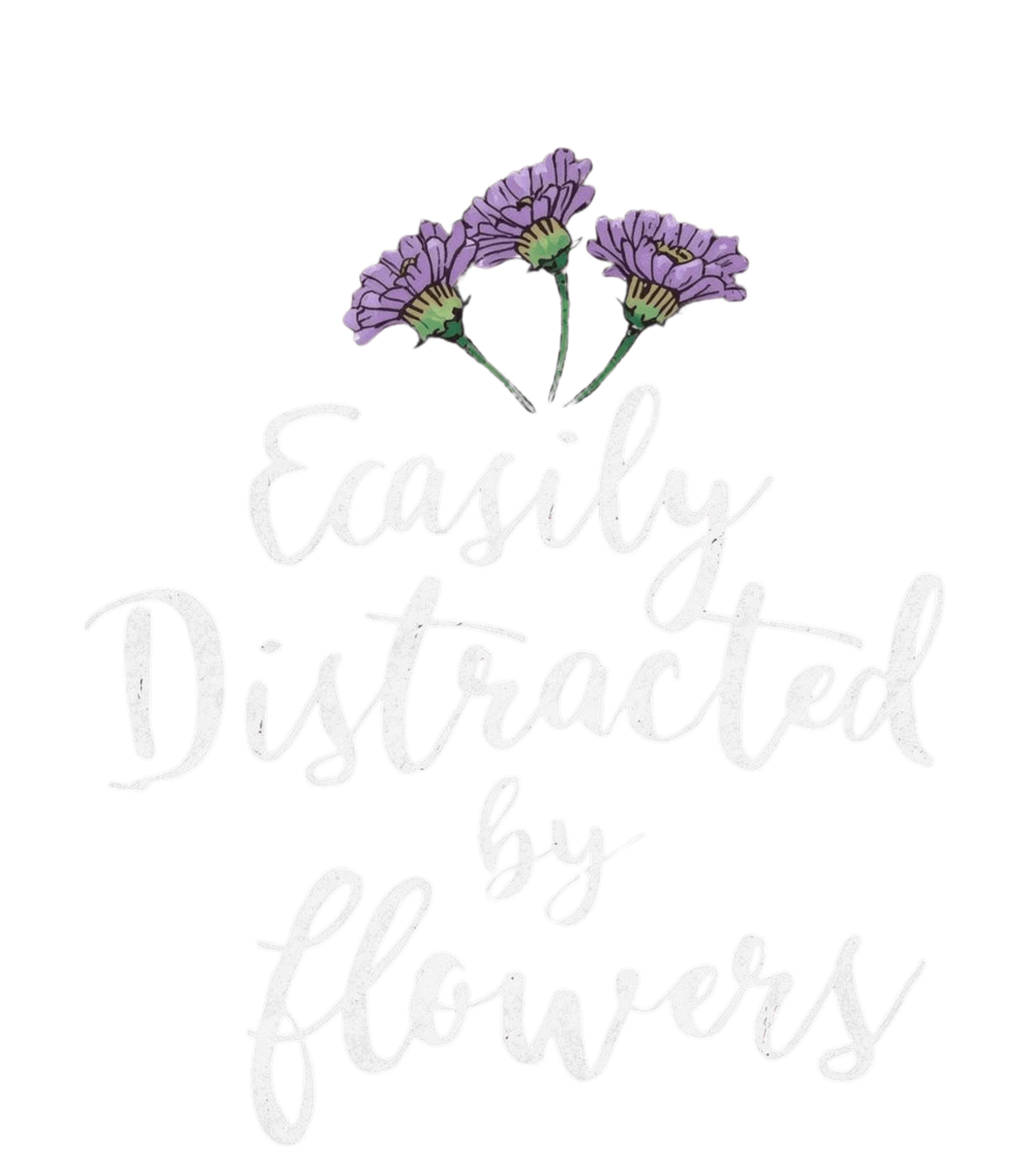 The design features a whimsical, hand-lettered phrase 'Easily Distracted by Flowers' in a distressed white script. Above the text are three watercolor-style illustrations of purple, daisy-like flowers with green stems. The overall artistic style combines a gentle, painterly feel for the flowers with a relaxed, textured typography, creating a lighthearted and charming mood.