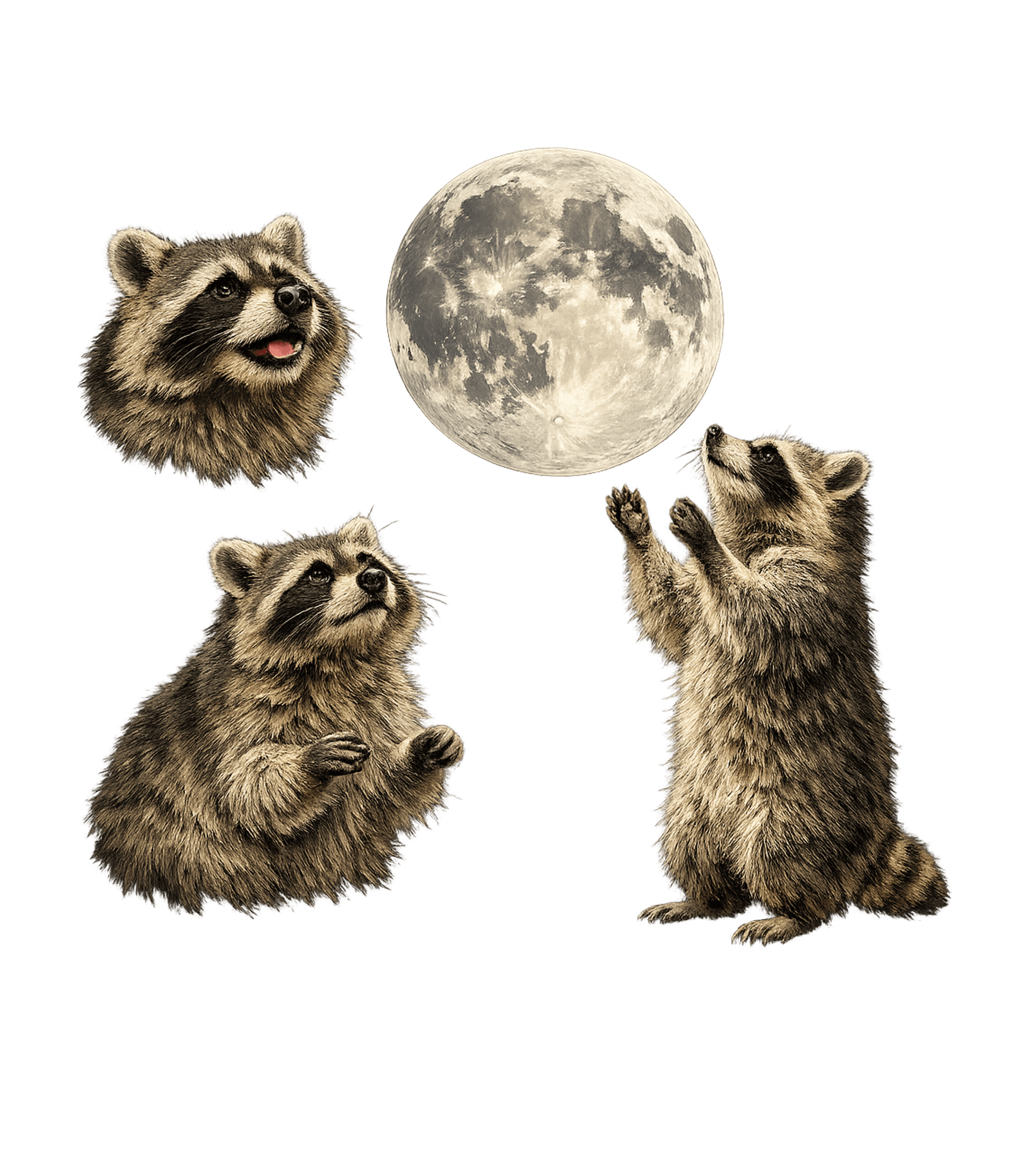 This captivating artwork features three inquisitive raccoons, each looking up with fascination at a detailed full moon. The design captures the charming and curious nature of these beloved nocturnal creatures, making for an eye-catching and thoughtful graphic.