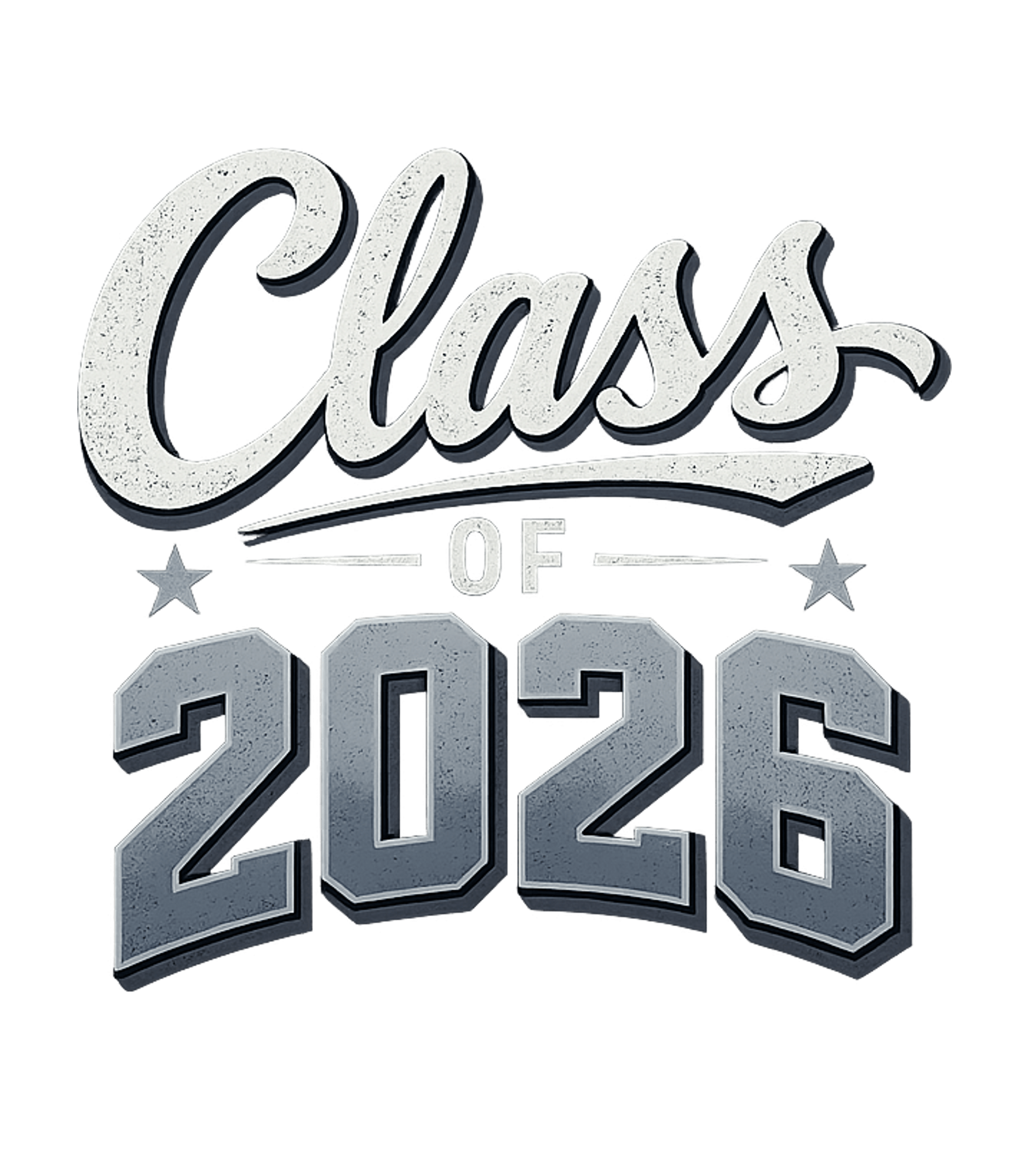 This design features the prominent "Class of 2026" text, stylized with a vintage, distressed aesthetic. It combines a classic script font for "Class" and bold, block letters for "2026", accented by subtle stars and a textured overlay. The artwork embodies a retro yet celebratory feel for this significant milestone.