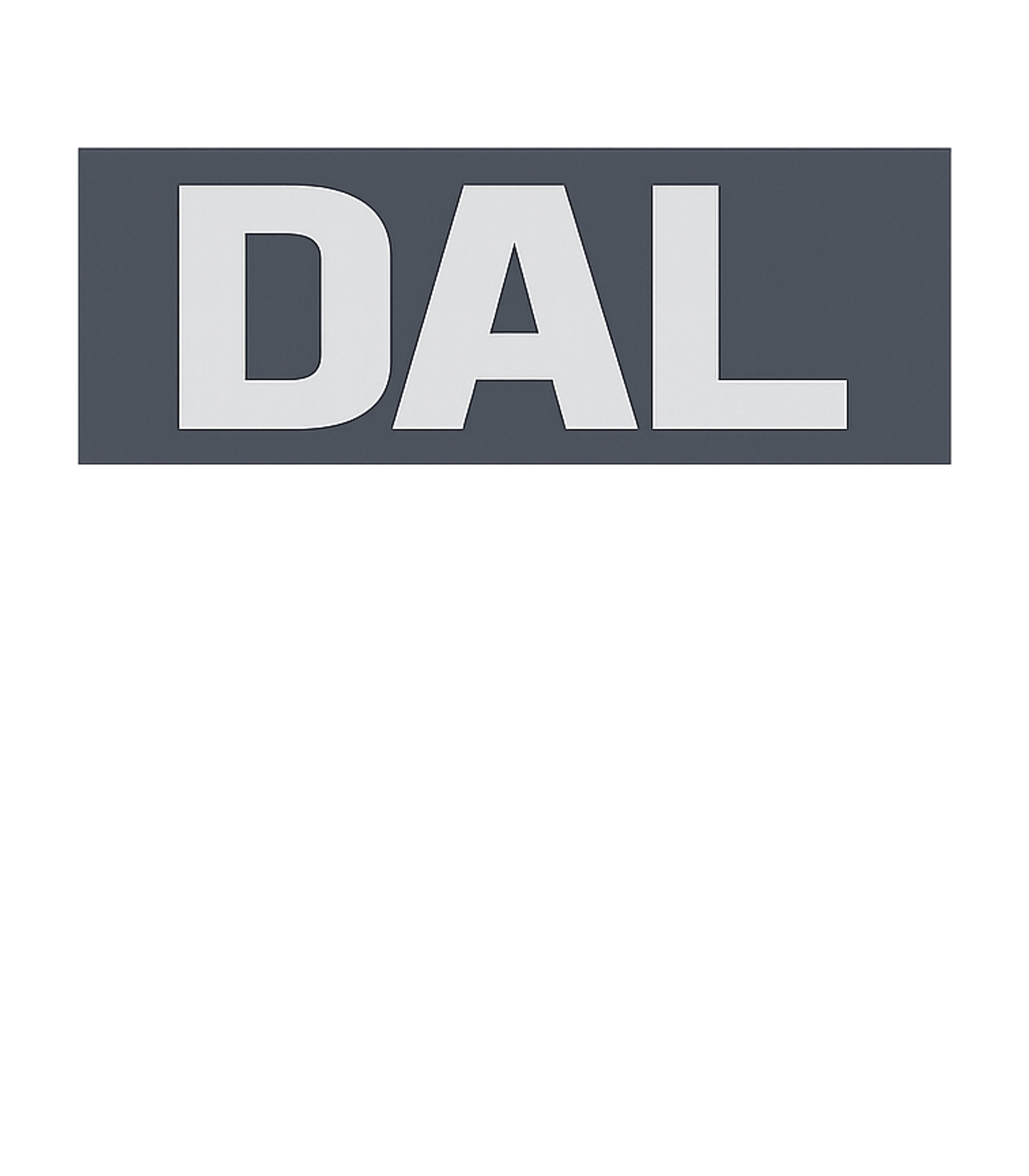 This design features the bold, capitalized letters "DAL" presented in a clean, modern sans-serif font. The text is set against a dark, contrasting rectangle, creating a clear and impactful visual statement. Its straightforward aesthetic focuses on the acronym itself, making it easily recognizable.