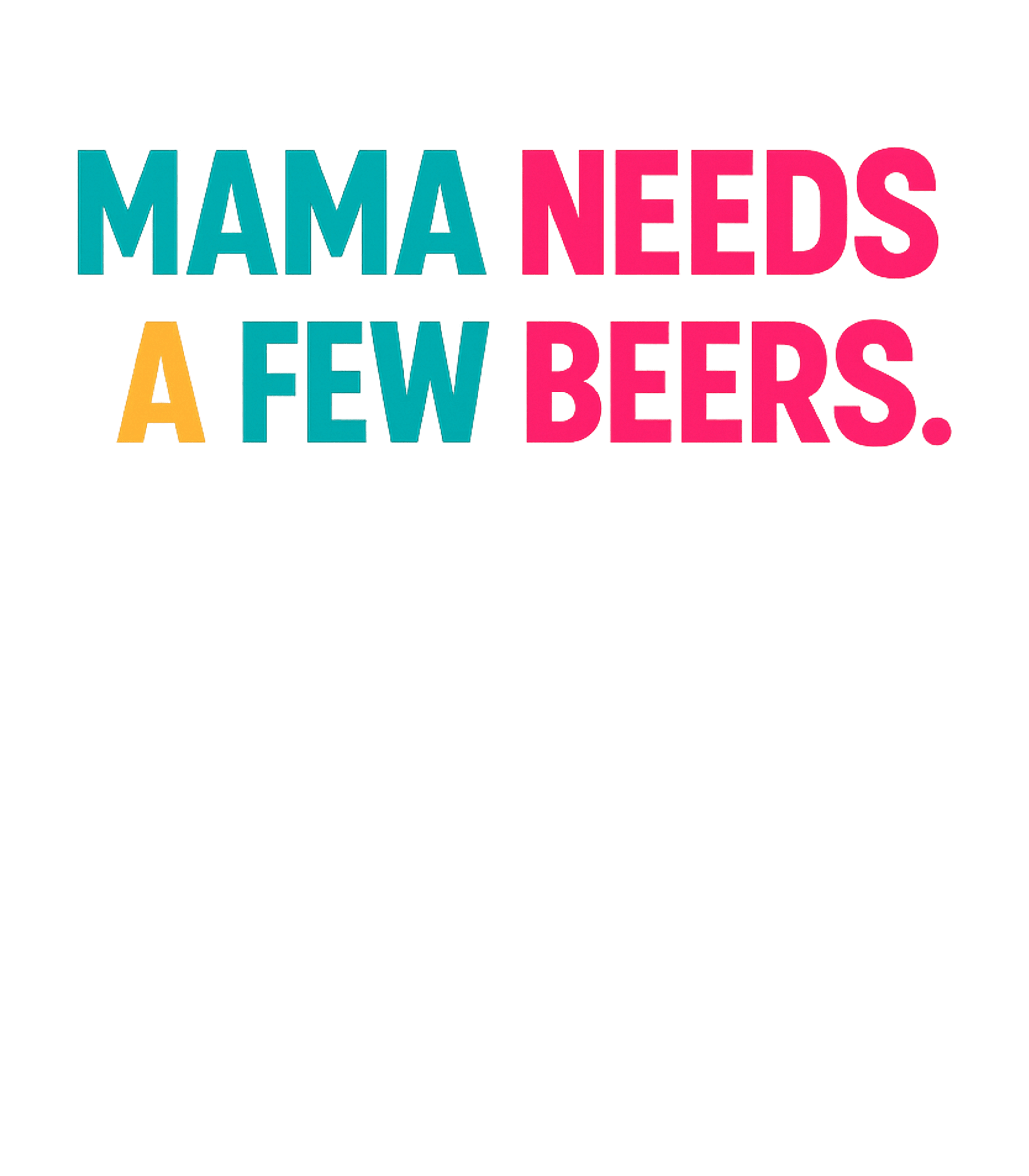 The artwork features the capitalized phrase "Mama Needs A Few Beers." in a bold, sans-serif font. The text is rendered in contrasting vibrant colors: teal for "MAMA", hot pink for "NEEDS", yellow for "A", teal for "FEW", and hot pink for "BEERS." The punctuation mark is also hot pink. This playful and energetic color palette stands out against the solid black background, conveying a fun and lighthearted mood.