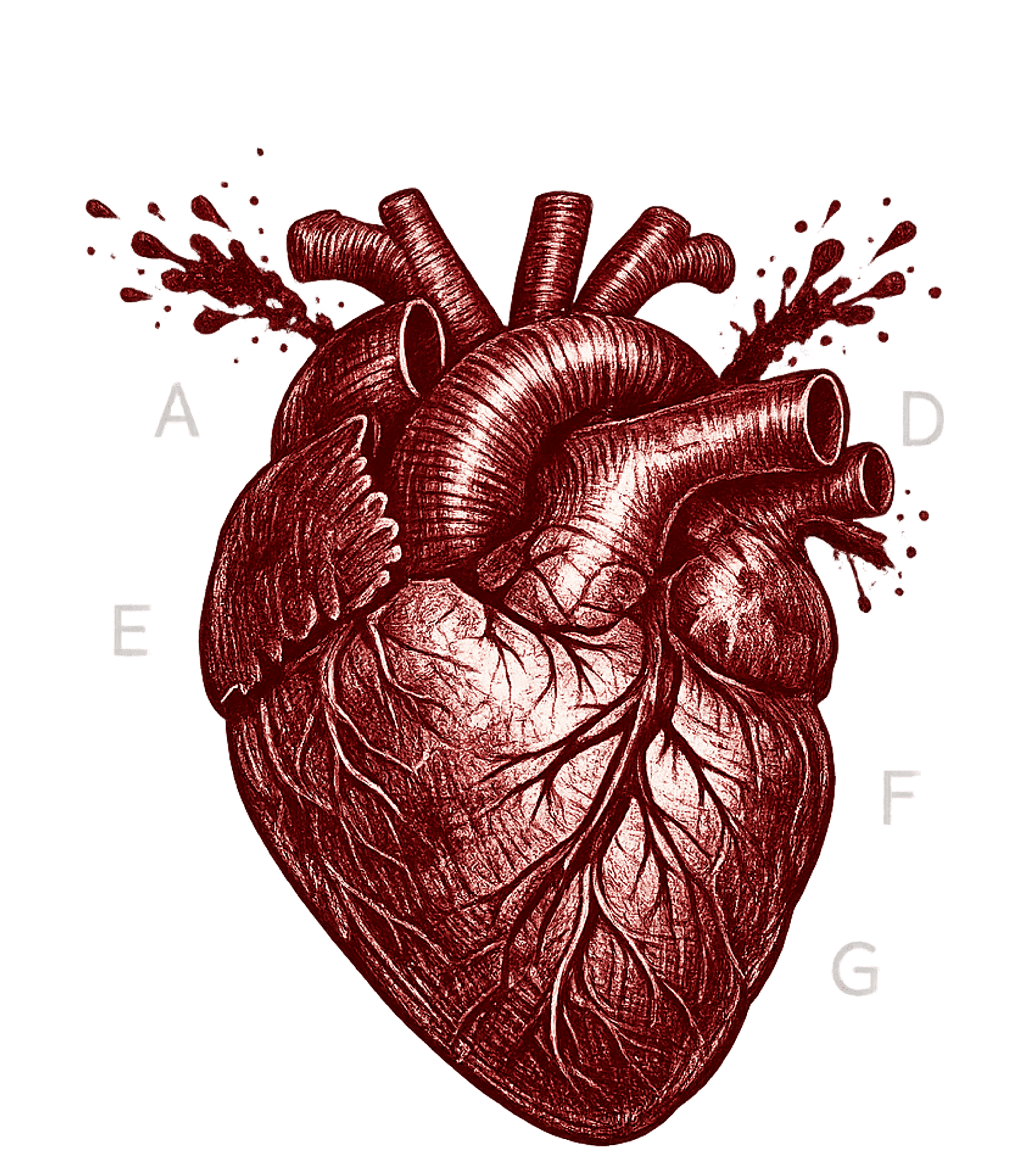 The artwork features a highly detailed, hand-drawn anatomical heart in a rich, dark red, set against a stark black background. Splatters of the same deep red create a visceral, dramatic effect, while faded grey letters (A, D, E, F, G) subtly suggest musical notation. The style evokes vintage anatomical etchings with a modern, edgy, and somewhat gothic mood.