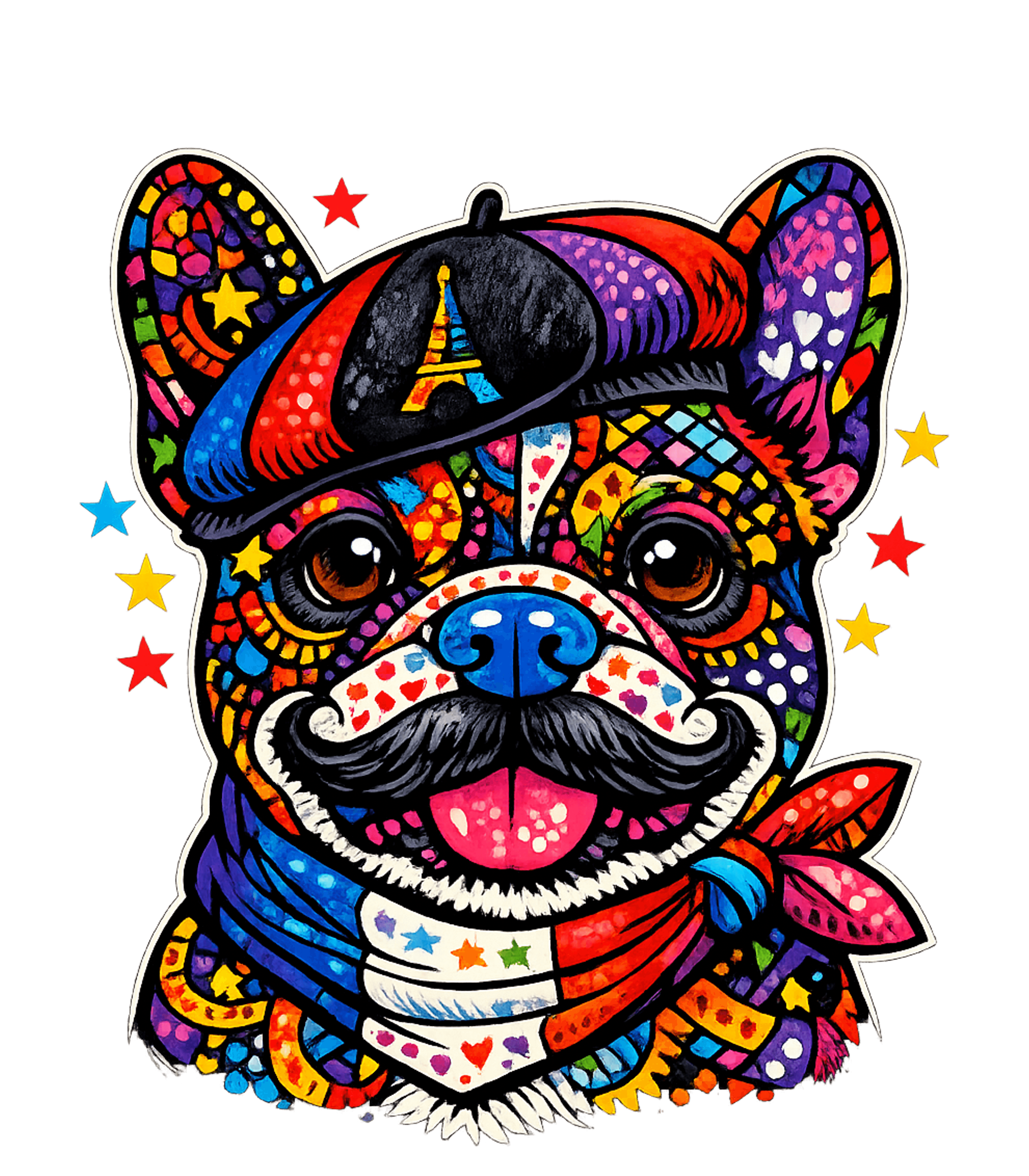 This unique t-shirt design features a French Bulldog portrayed in a dazzling, mosaic-like artistic style. Adorned with a classic black beret topped with an Eiffel Tower icon, a distinguished mustache, and a tri-color French flag scarf, this artwork celebrates a fusion of canine charm and Parisian elegance.