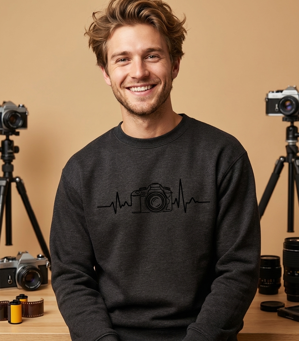 This minimalist graphic features a clean white line drawing of a camera, seamlessly integrated into an electrocardiogram (ECG) heartbeat line. The design symbolizes the vital role photography plays in the wearer's life, representing a true passion and dedication to the art.