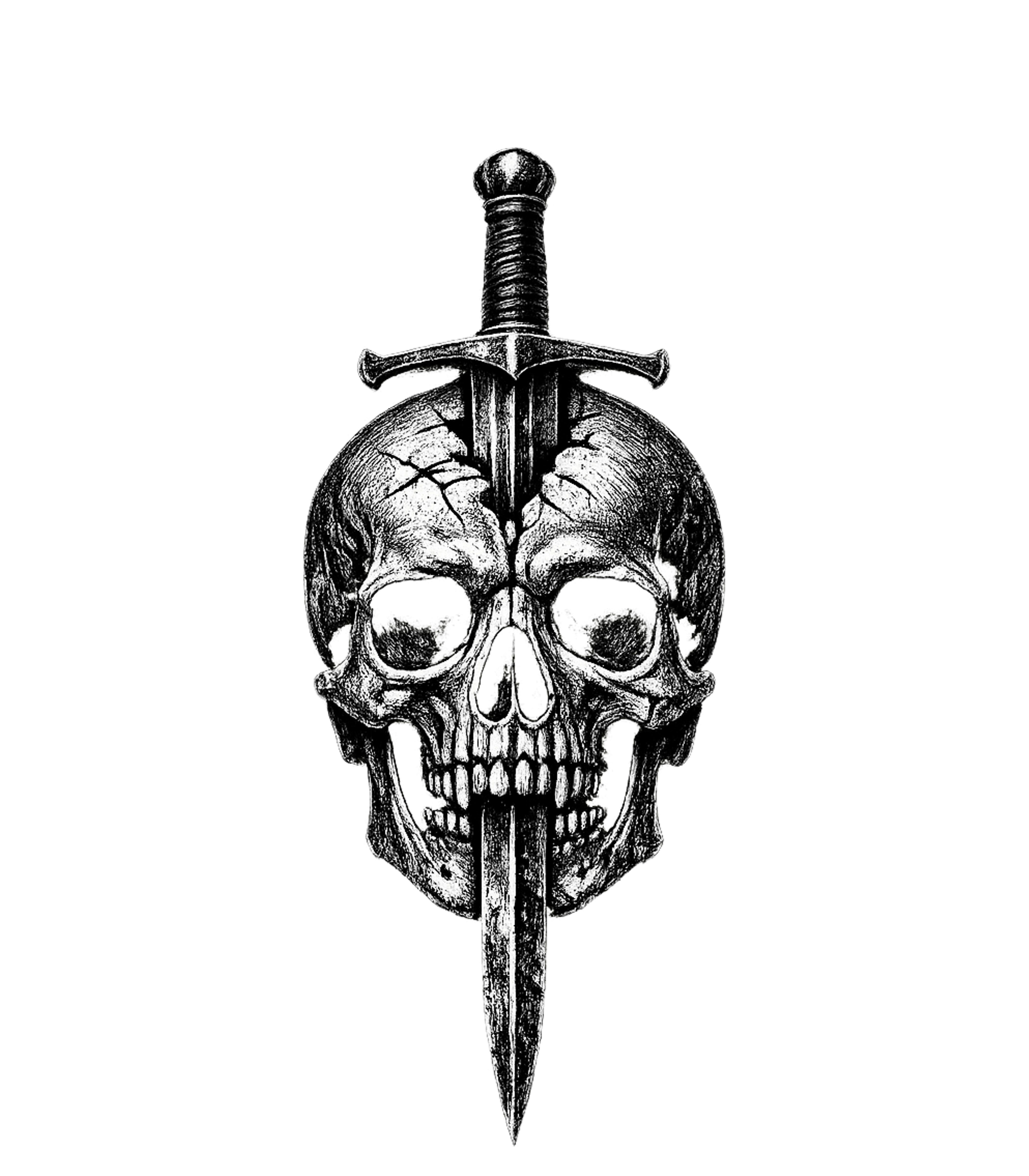 This striking graphic features a meticulously detailed human skull, dramatically pierced by a sword that enters through the cranium and exits through the mouth. The monochromatic black and white palette enhances its raw, intense, and stark visual impact. The artwork's intricate linework highlights the textures of bone and metal, creating a powerful and enduring image.