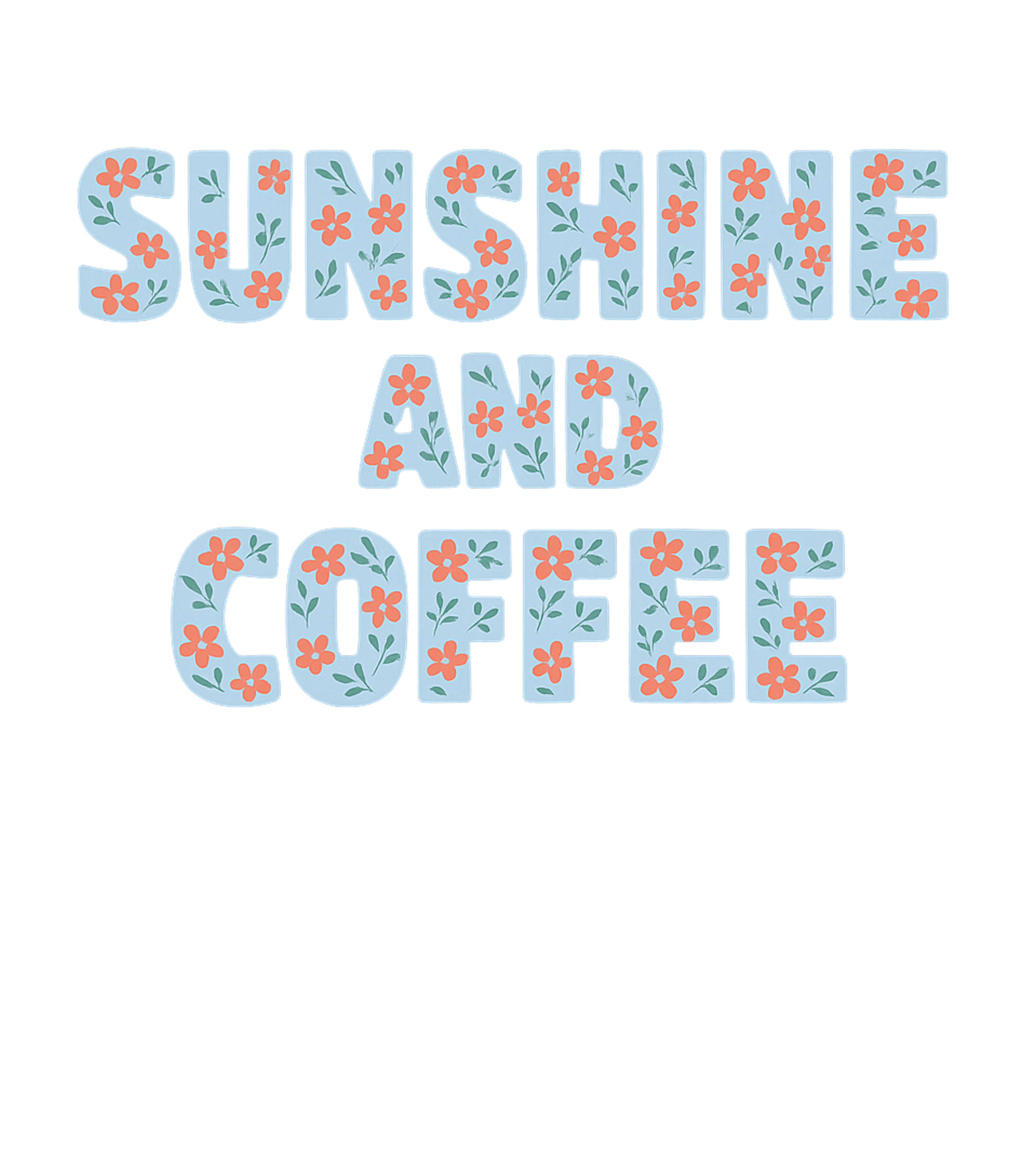This design features the heartwarming phrase "Sunshine and Coffee" in a distinctive font. Each letter is adorned with a charming floral pattern, presenting small orange blossoms and delicate green leaves on a light blue background.