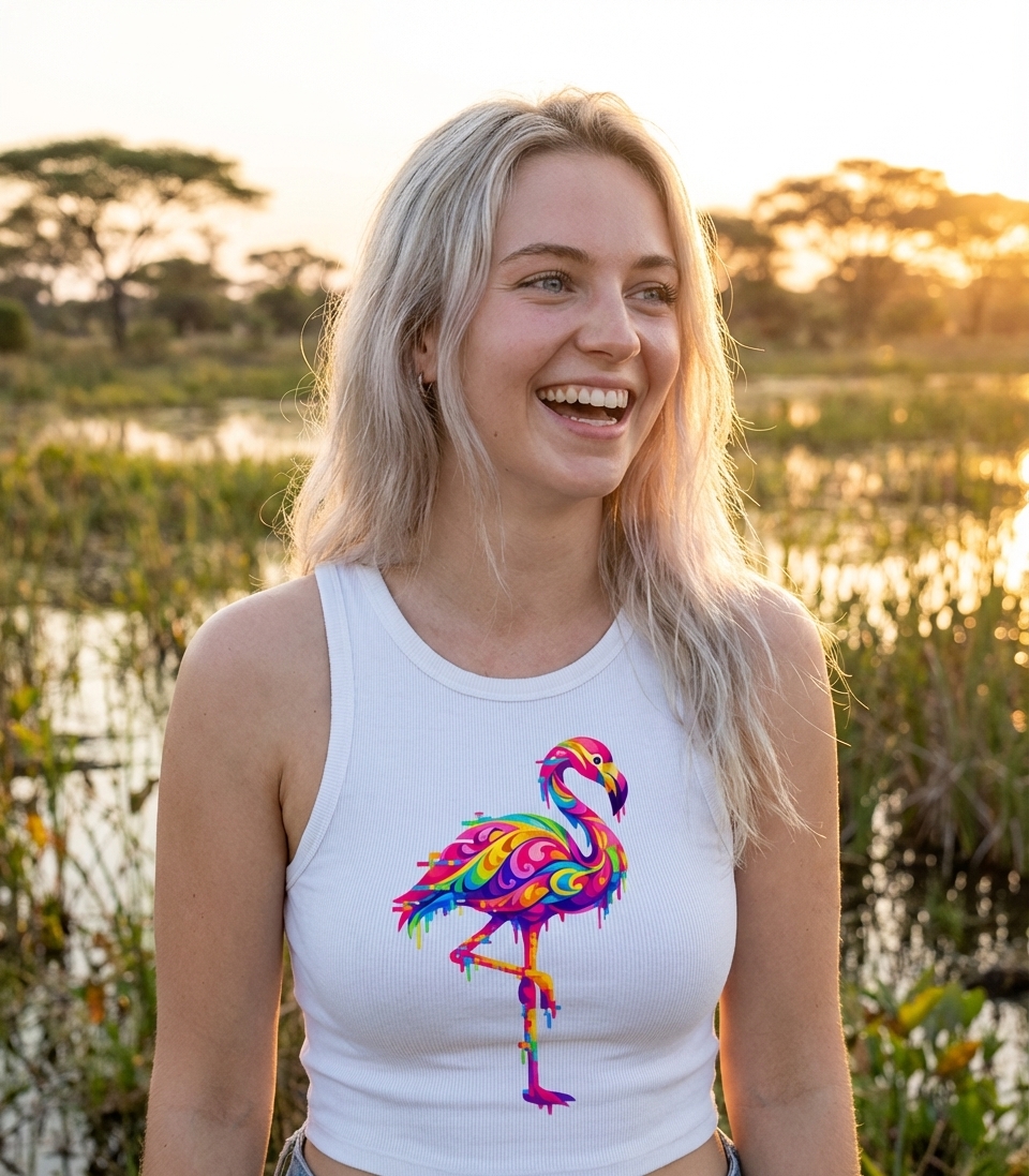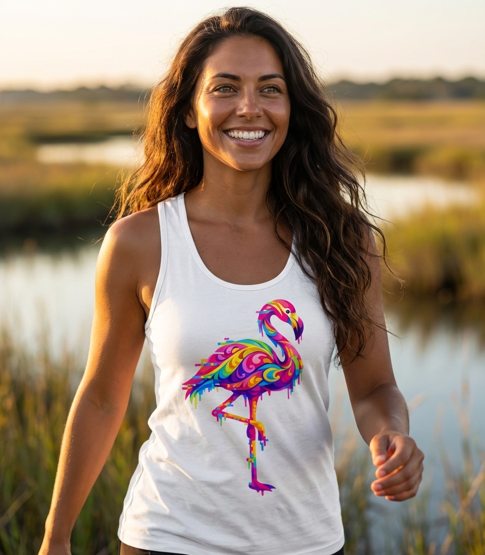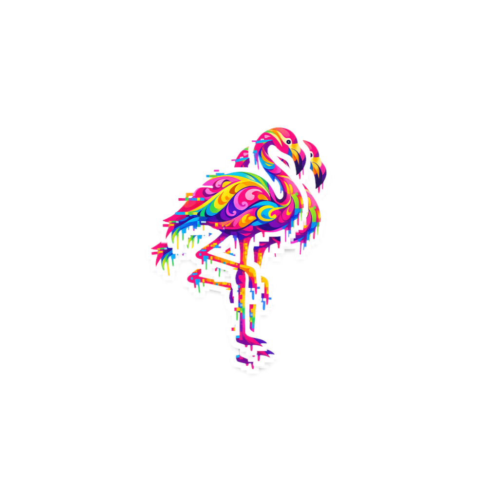 This vibrant flamingo design captures the artistic style of those who appreciate unique wildlife art, bold colors, and a modern, digital aesthetic.