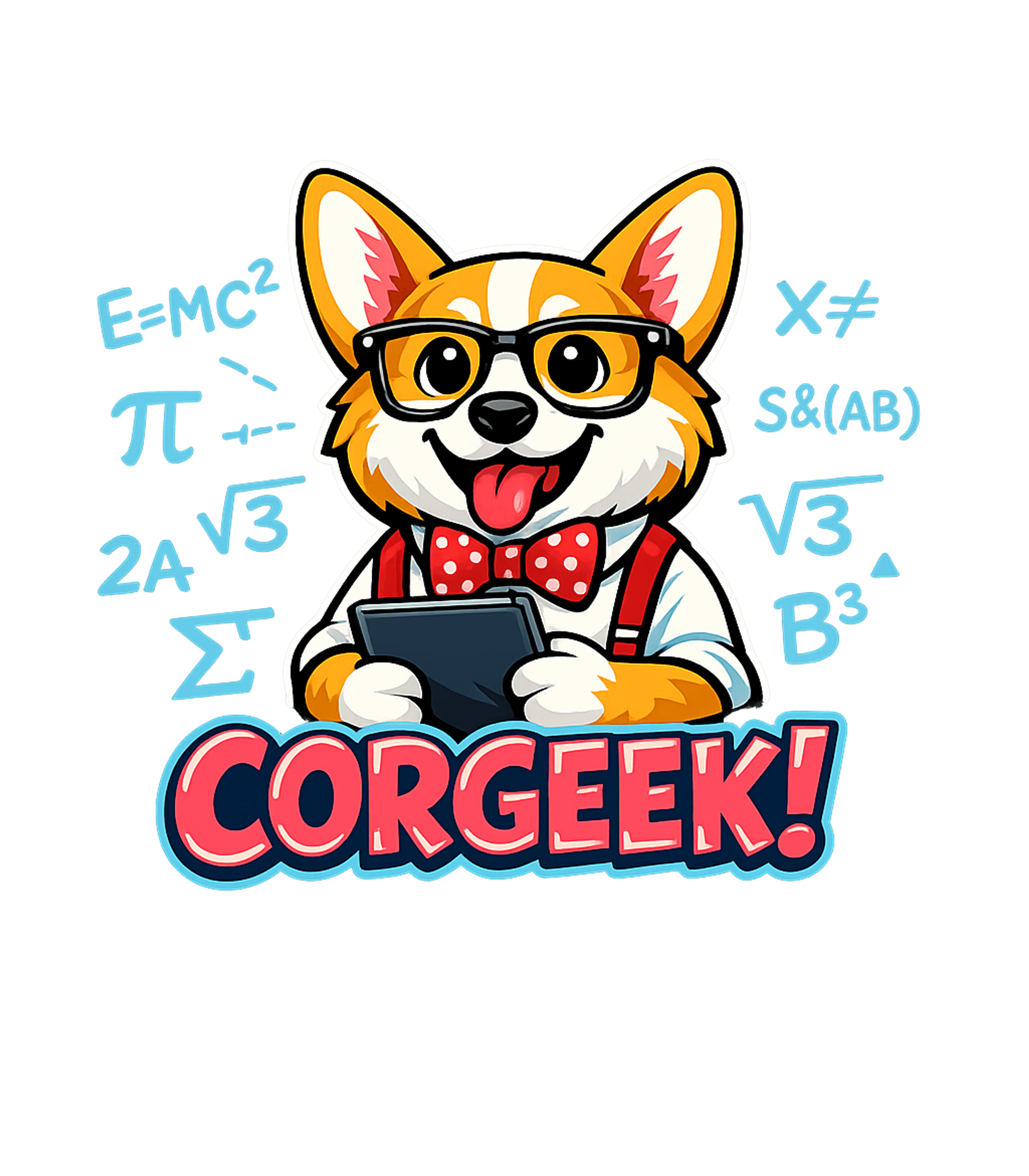 This unique graphic features an adorable corgi wearing scholarly glasses and a bowtie, intently focused on a tablet. Surrounding the intelligent pup are various mathematical and scientific symbols, including E=MC², Pi, square roots, and sigma, creating a truly 'geeky' ambiance.