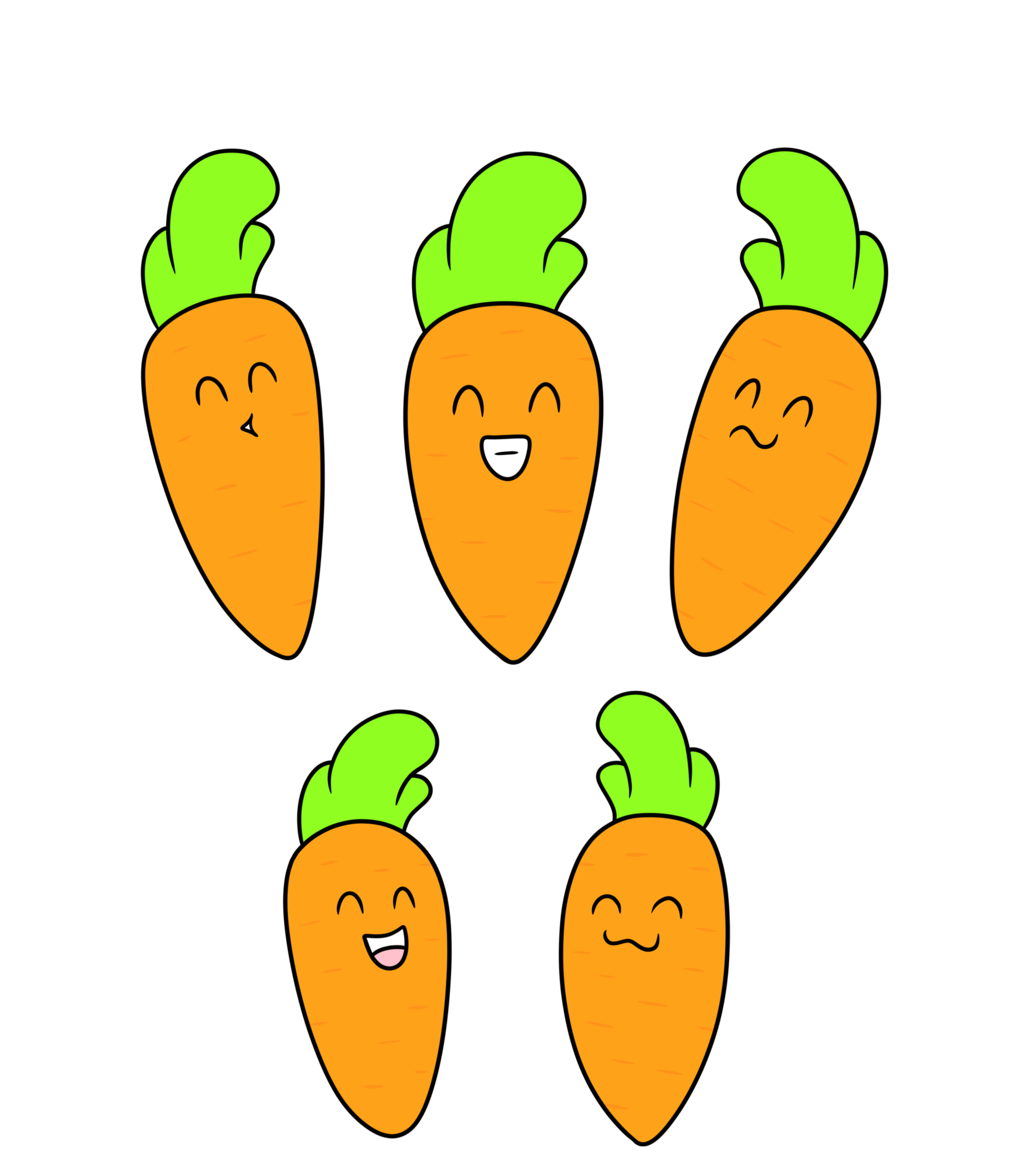 The artwork employs a simple, bold black outline with flat blocks of vibrant orange for the carrots and bright green for their tops. The minimalist facial expressions, using dots and simple curves, convey a range of happy and content moods. The overall style is clean, friendly, and cartoonish, designed to evoke a lighthearted and positive feeling.