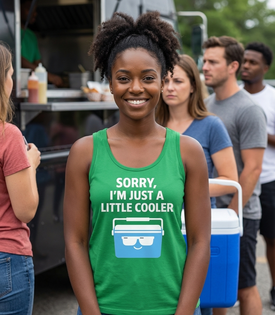 The phrase "Sorry, I'm Just A Little Cooler" is a witty double entendre. It combines a faux apology with a boast, suggesting superiority (being "cooler") while literally depicting a small cooler. This self-aware humor is perfect for lighthearted personalities.