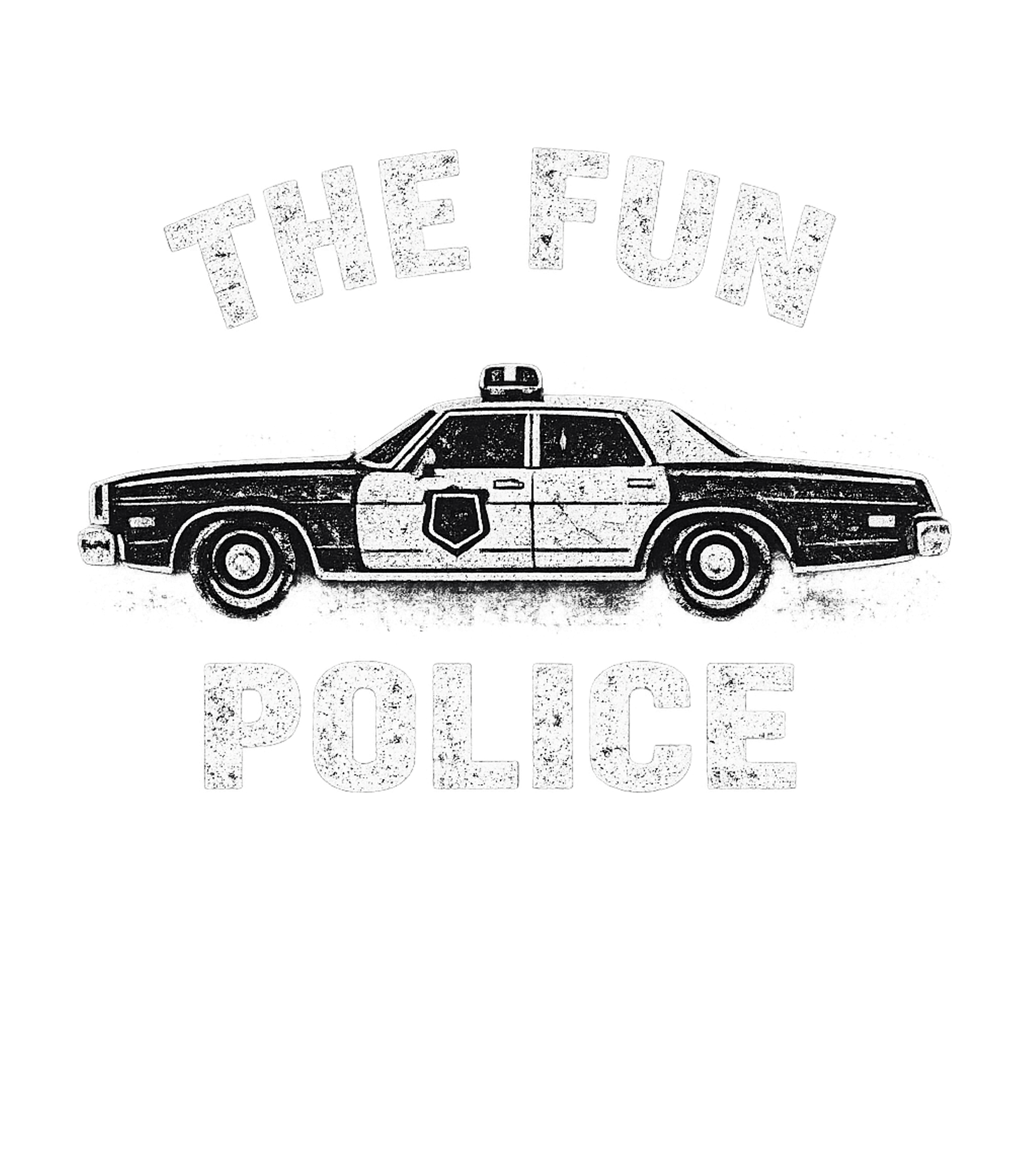 This artwork showcases a classic American police car, rendered in a vintage, distressed black and white style. Above and below the vehicle, the phrase "THE FUN POLICE" is displayed in a matching gritty, retro font.