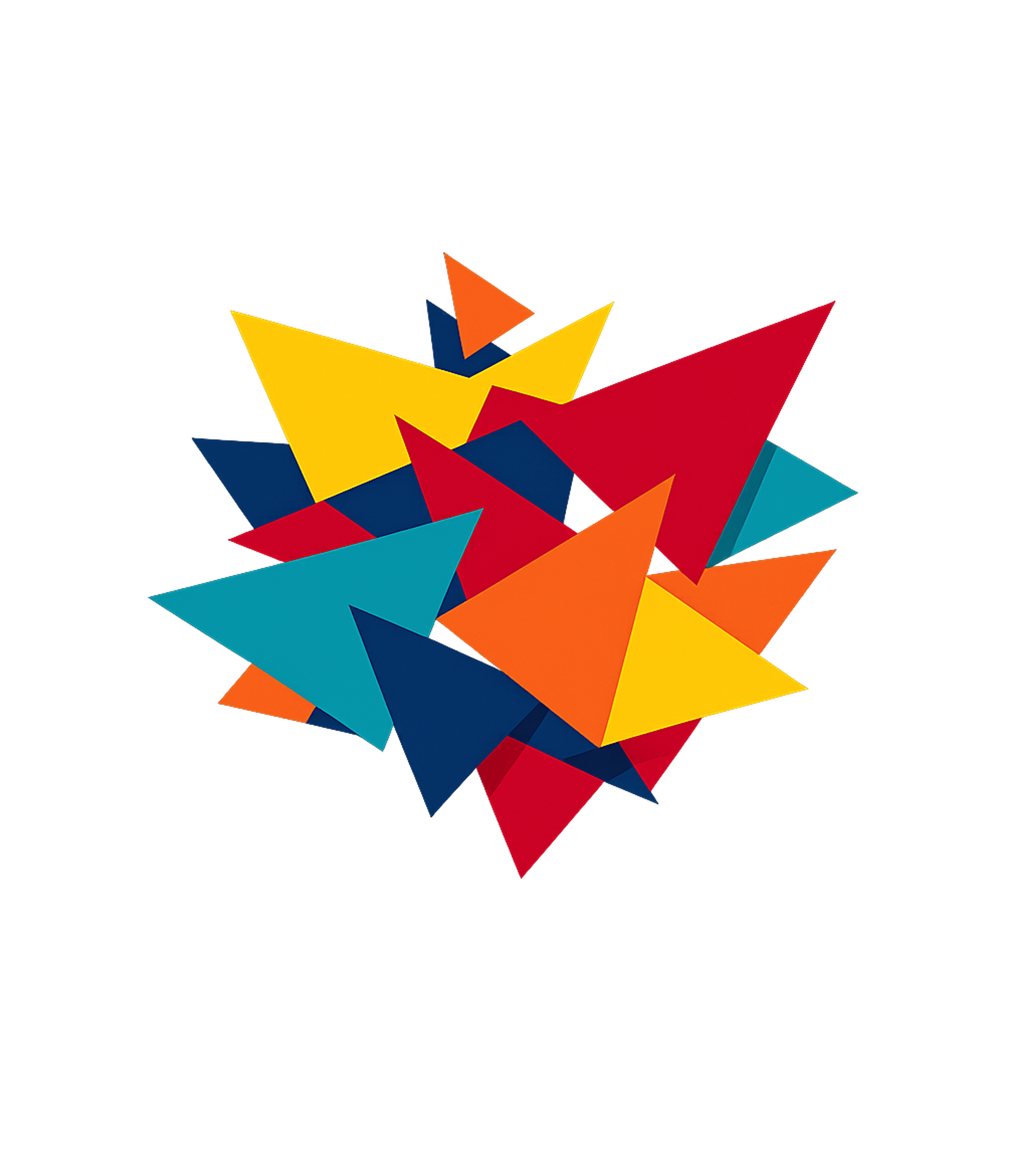 The artwork showcases a collection of sharp, flat geometric shapes including triangles and polygons, presented in a layered fashion to create depth. The color palette is vibrant and rich, featuring primary and secondary hues like bright yellow, deep red, energetic orange, and various shades of blue and teal. The artistic style is modern abstract with a clean, vector-like finish, conveying a dynamic and energetic mood.